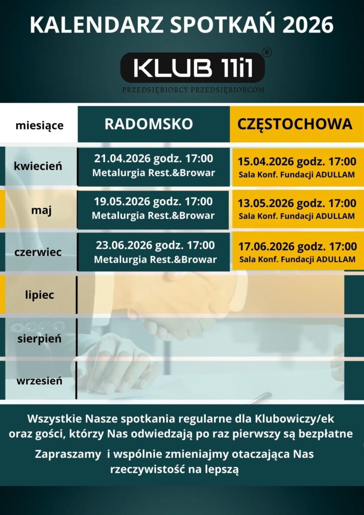 Swoją działalność i ofertę współpracy Klub11i1 w pierwszej kolejności kieruje do LOKALNYCH firm, osób i innych ww podmiotów tj. z terenu powiatu radomszczańskiego i sąsiadujących.